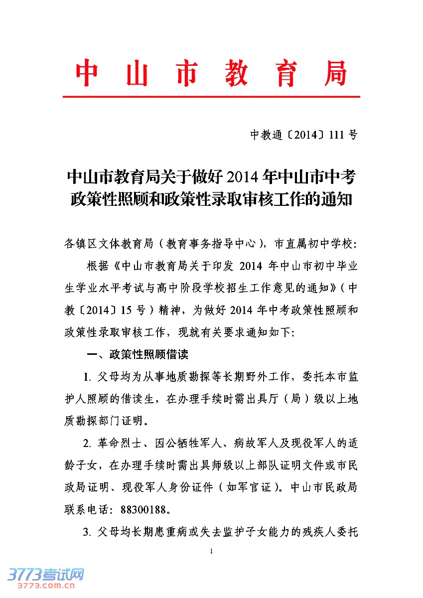中山市教育局关于做好2014年中山市中考政策性照顾和政策性录取审核工作的通知