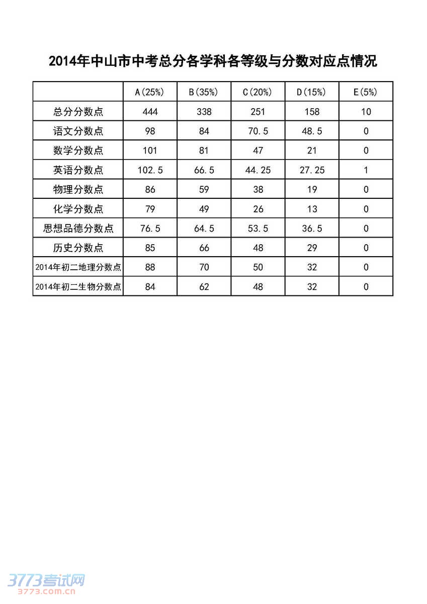 [图文]2014中山中考总分各学科各等级与分数对应点情况