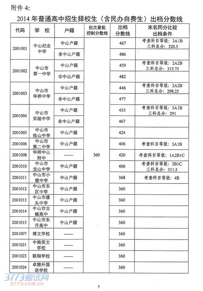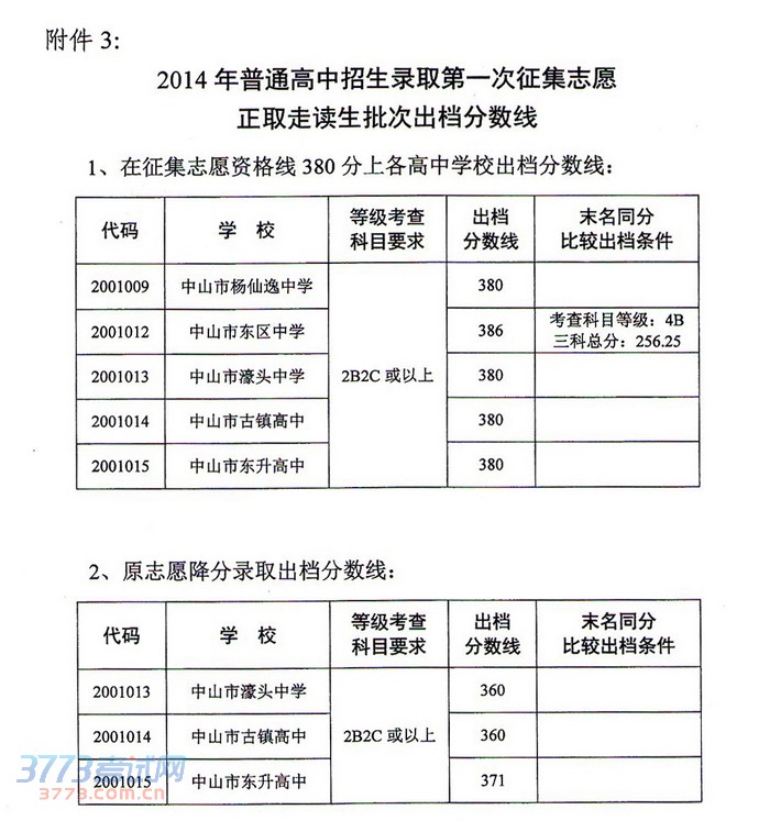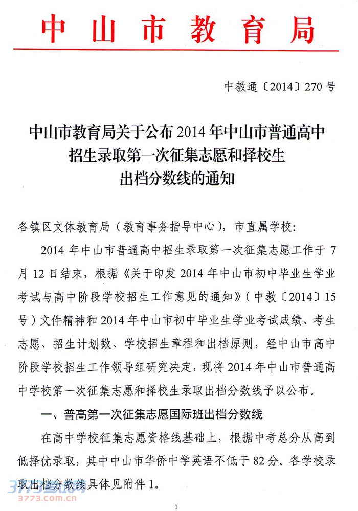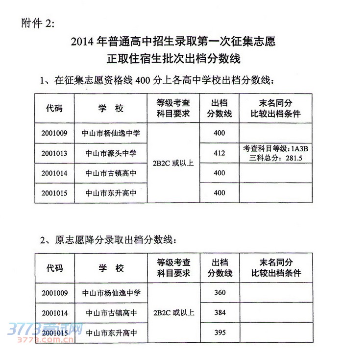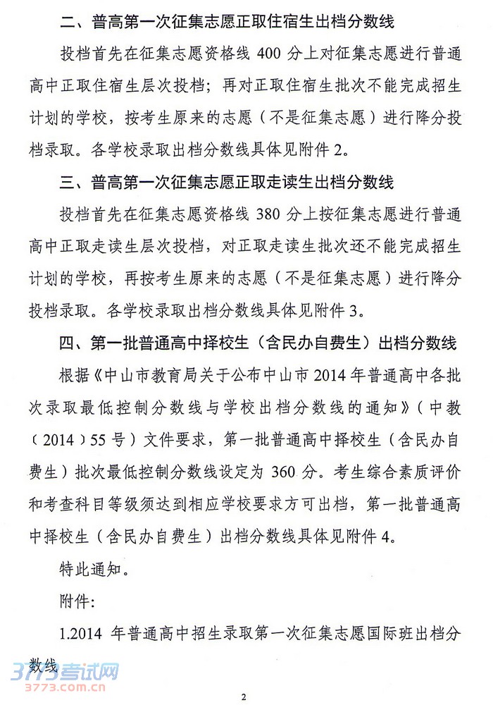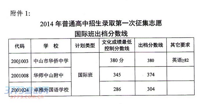 [组图]2014中山中考高中征集志愿和择校生出档分数线