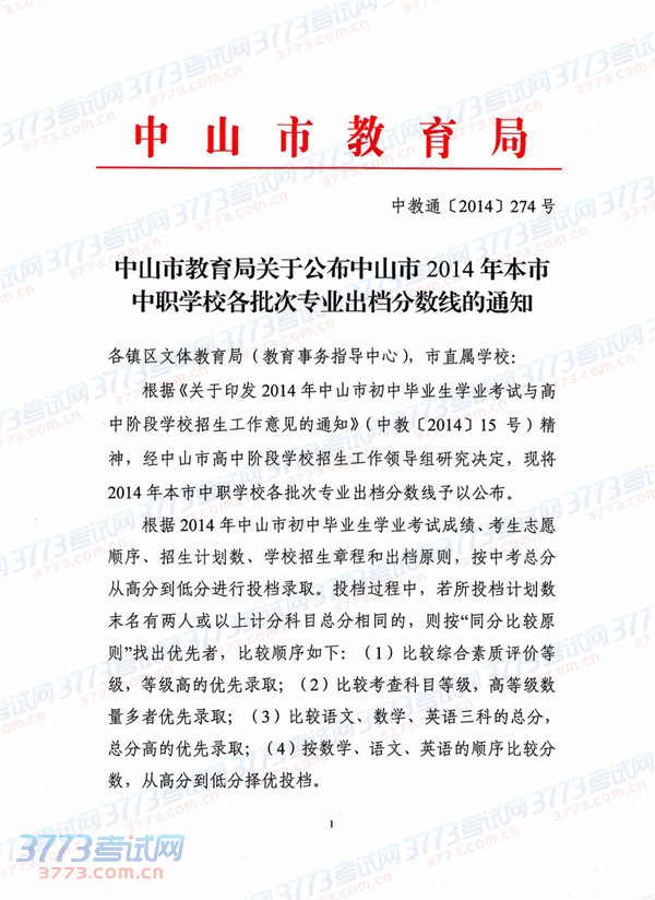 中山市教育局关于公布中山市2014年本市中职学校各批次专业出档分数线的通知