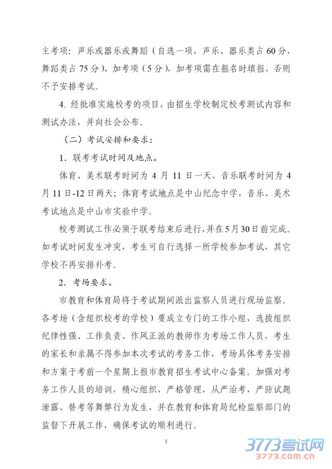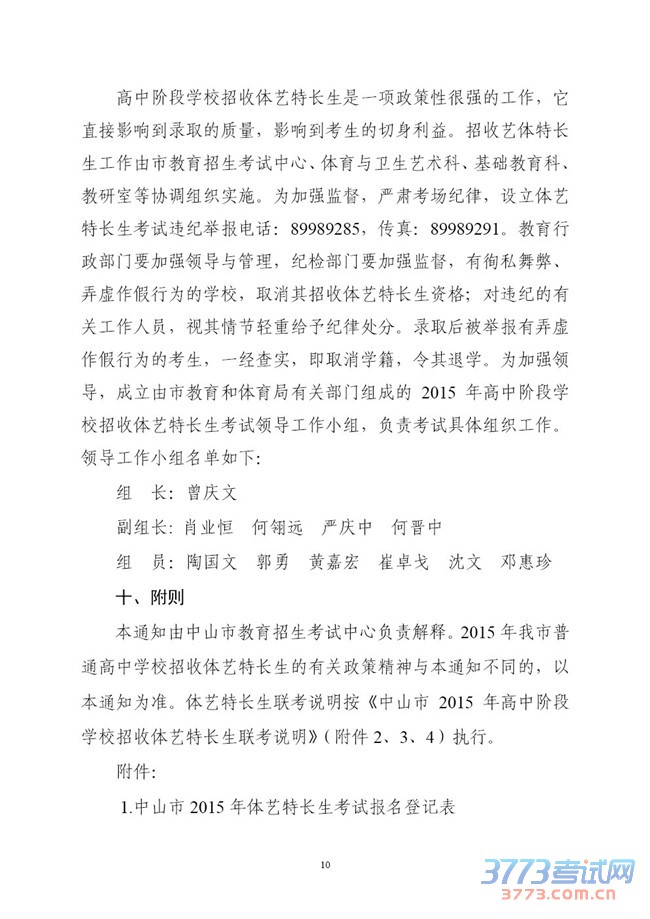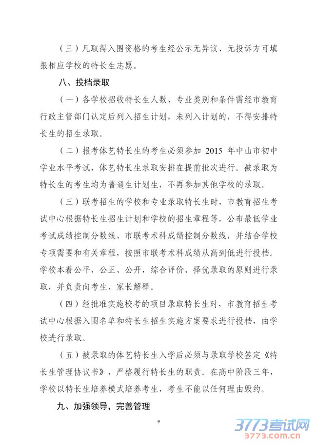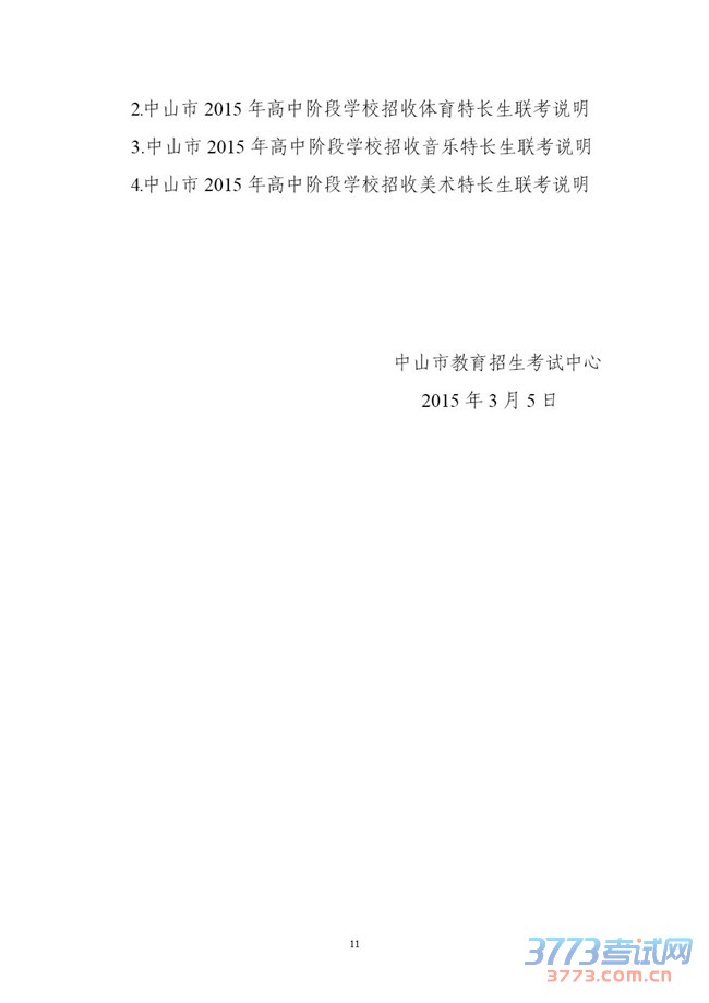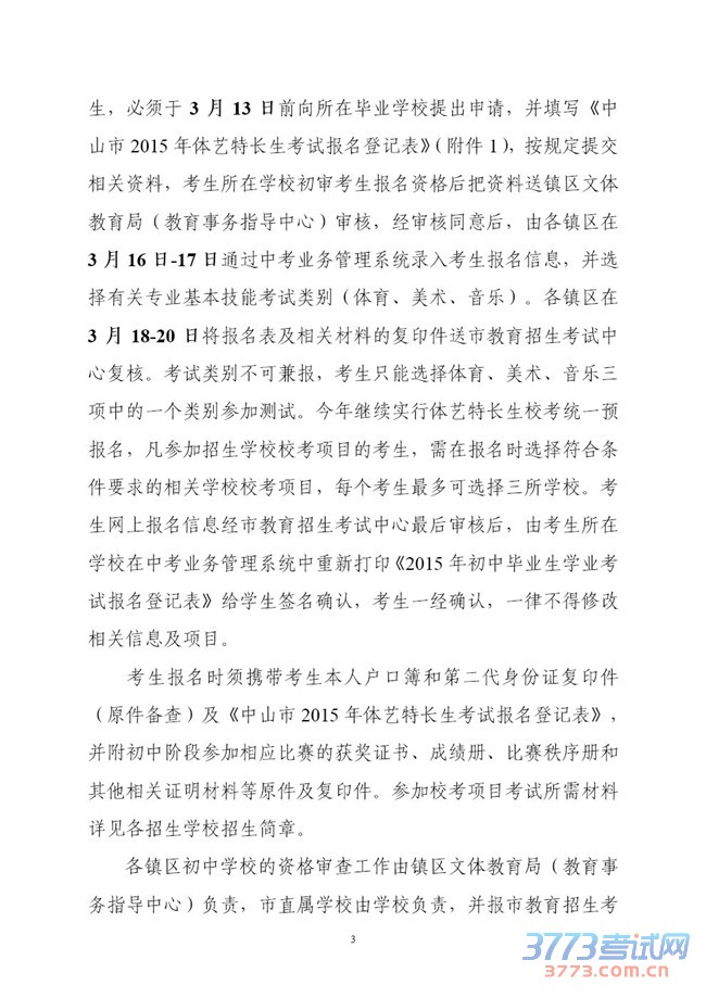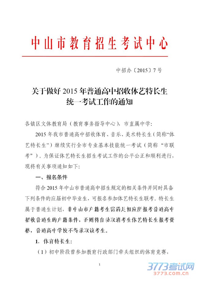 [组图]2015中山中考高中体艺特长生招生考试工作的通知