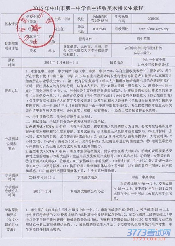 [图文]2015年中山一中高中美术特长生自主招生章程