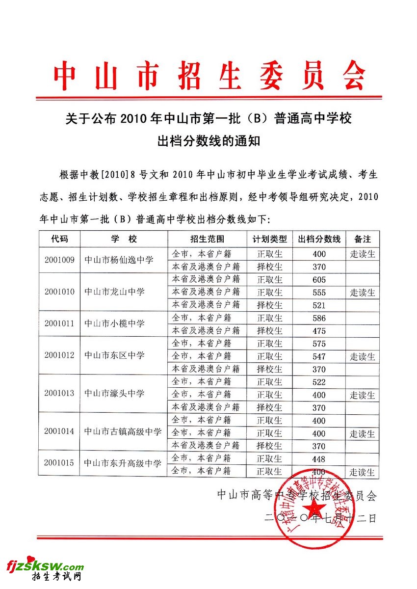 [图文]2010年中山市第一批(B)普通高中学校出档分数线的通知
