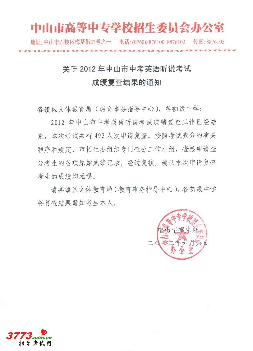 [图文]关于2012年中山市中考英语听说考试成绩复查的通知