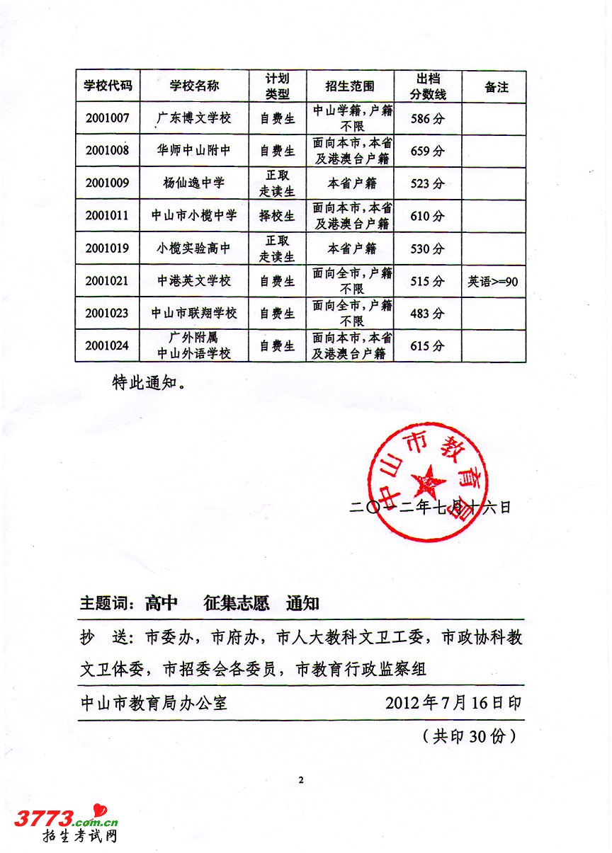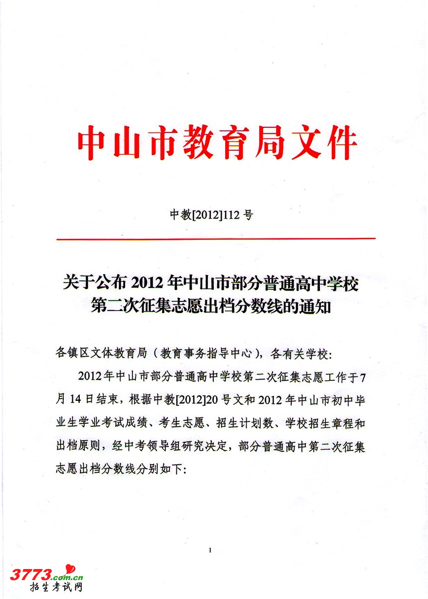 关于公布2012年中山市部分普通高中学校第二次征集志愿出档分数线的通知