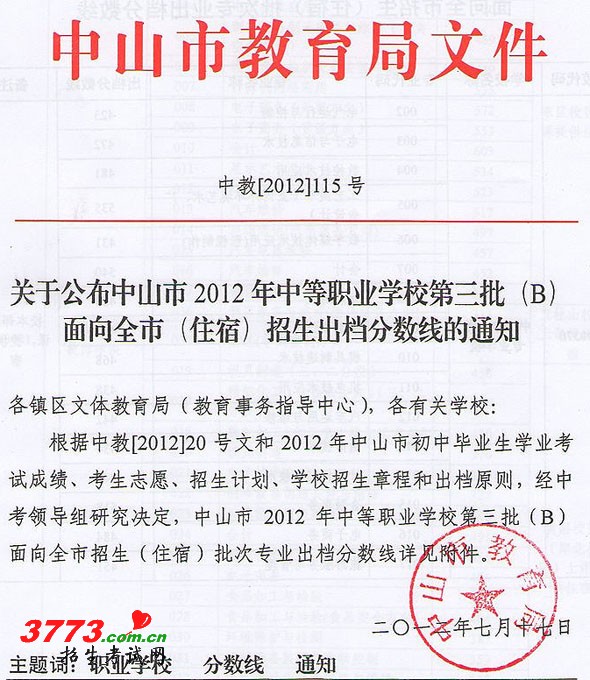 关于公布中山市2012年中等职业学校第三批(B)面向全市(住宿)招生出档分数线的通知
