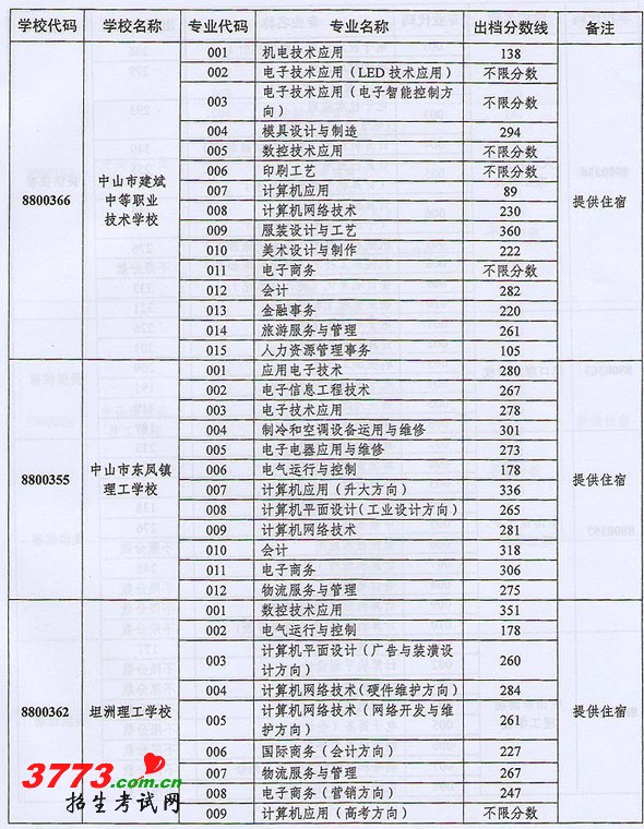 [组图]中山市2012年中职第三批(B)面向全市(住宿)分数线