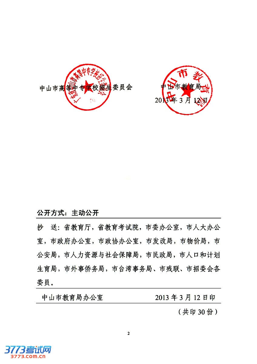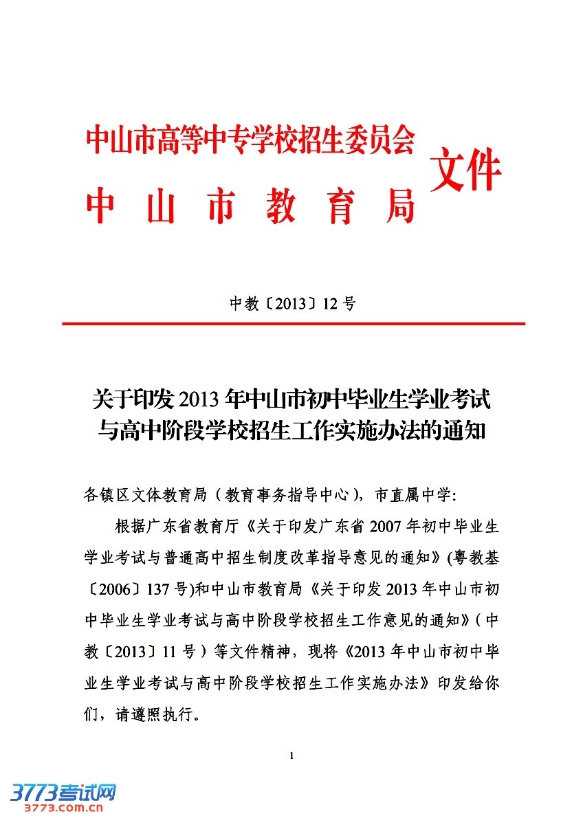 关于印发2013年中山市初中毕业生学业考试与高中阶段学校招生工作实施办法的通知