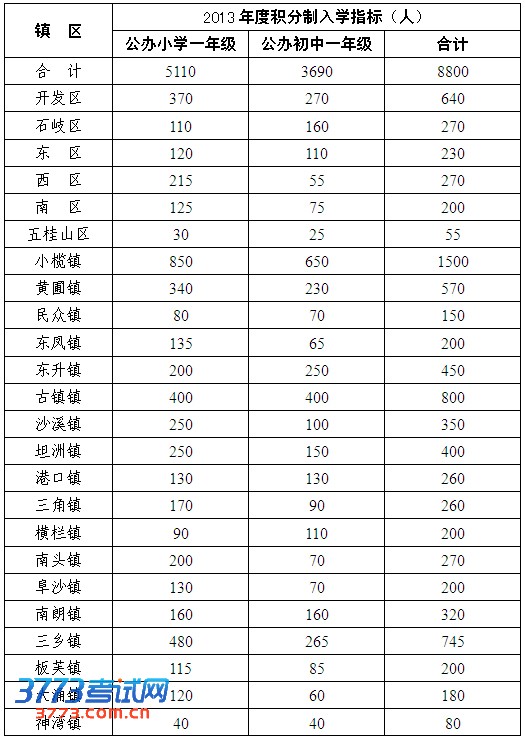 根据《中山市流动人员积分制管理暂行规定》及其实施细则,经市委市政府同意,2013年度全市流动人员积分制管理入读公办小学一年级、公办初中一年级的指标数分别为5110名、3690名,各镇区指标数具体分配如下: