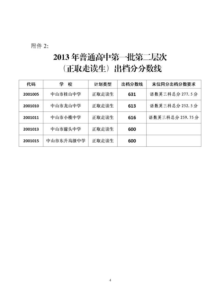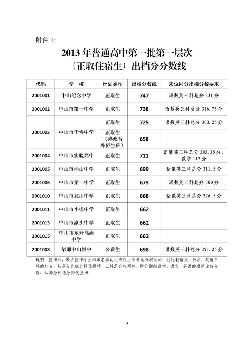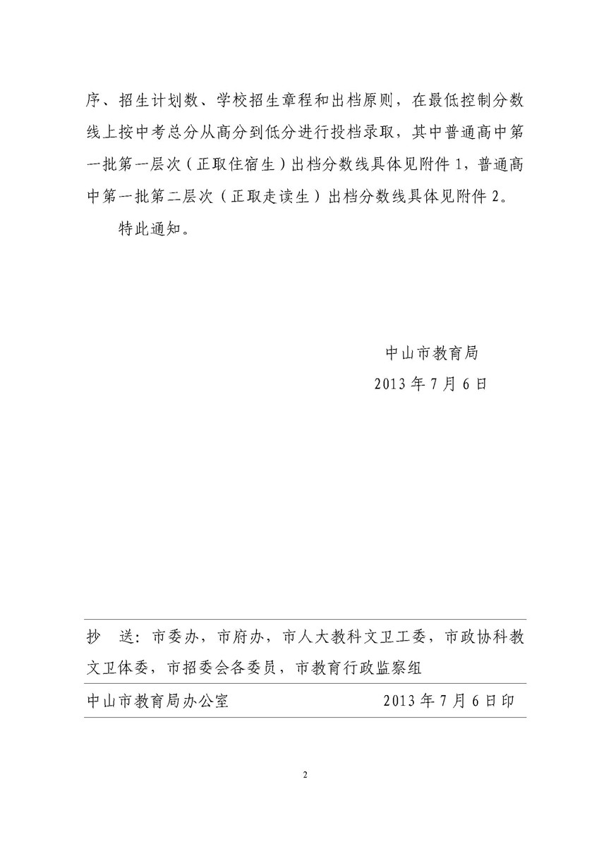 关于公布中山市2013年普通高中招生第一批次学校出档分数线的通知