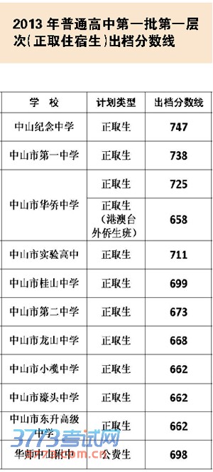 在中考成绩公布的当天,市招生办同时公布了全市2013年普通高中第一批第一层次(正取住宿生)学校出档分数线(见表)。民办高中方面,中山华附在该批次的公费生录取分数线为698分。