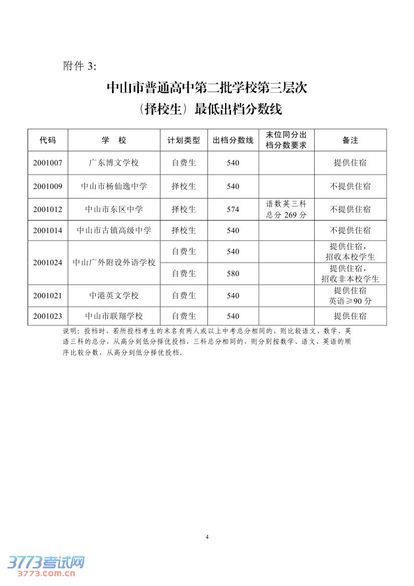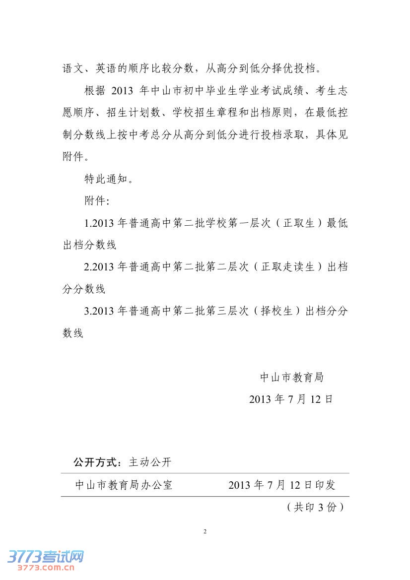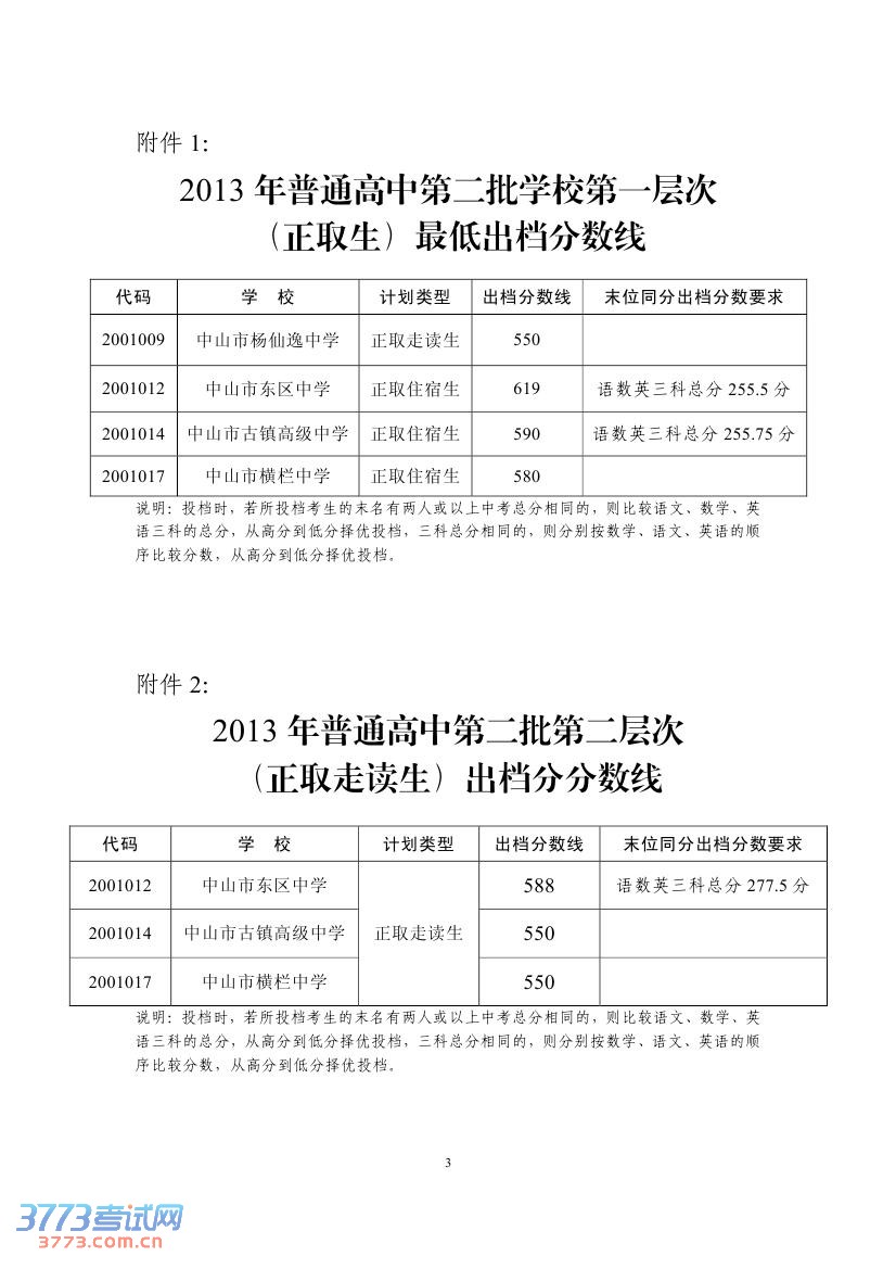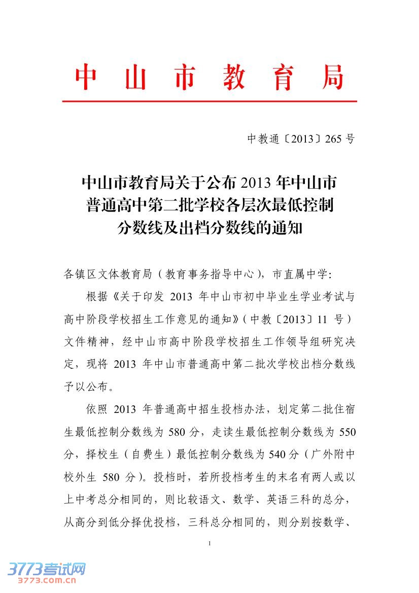 关于公布2013年中山市普通高中第二批学校各层次最低控制分数线及出档分数线的通知