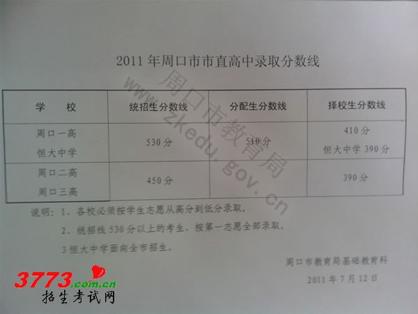 2011年周口市中招录取分数线 2011年河南周口市中招录取分数线