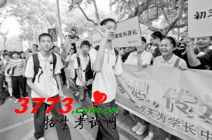 “才子文思泉涌,佳人走笔如龙”、“筑最美弘光梦,刮最炫民族风”……昨天上午8:00,人民中学考场外一群初一的孩子和家长精心布置了一条“星光大道”,他们高高举起16块助威展板站在通道两侧,把轻松的心情和真挚的鼓励传递给每一位走过的初三学长。