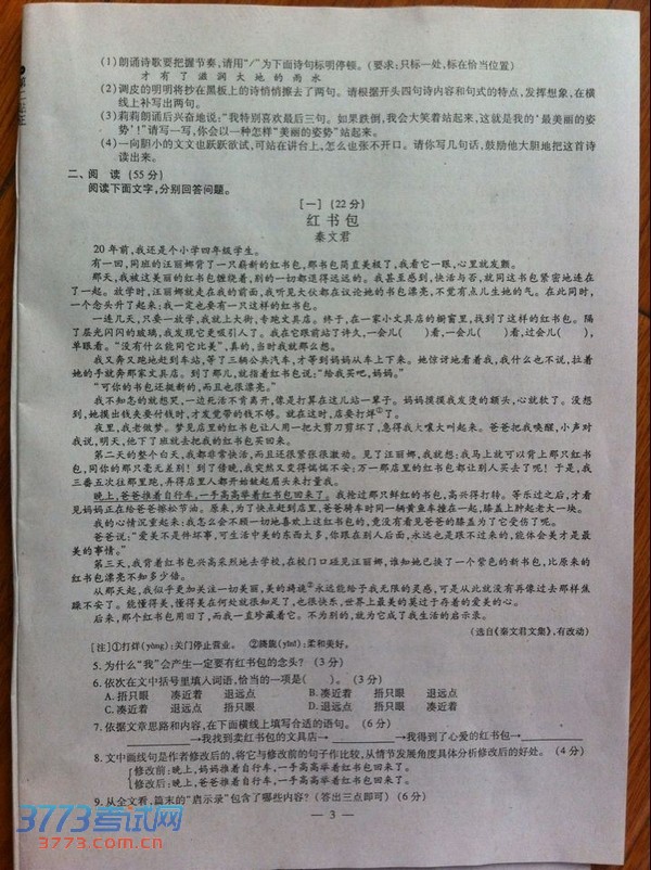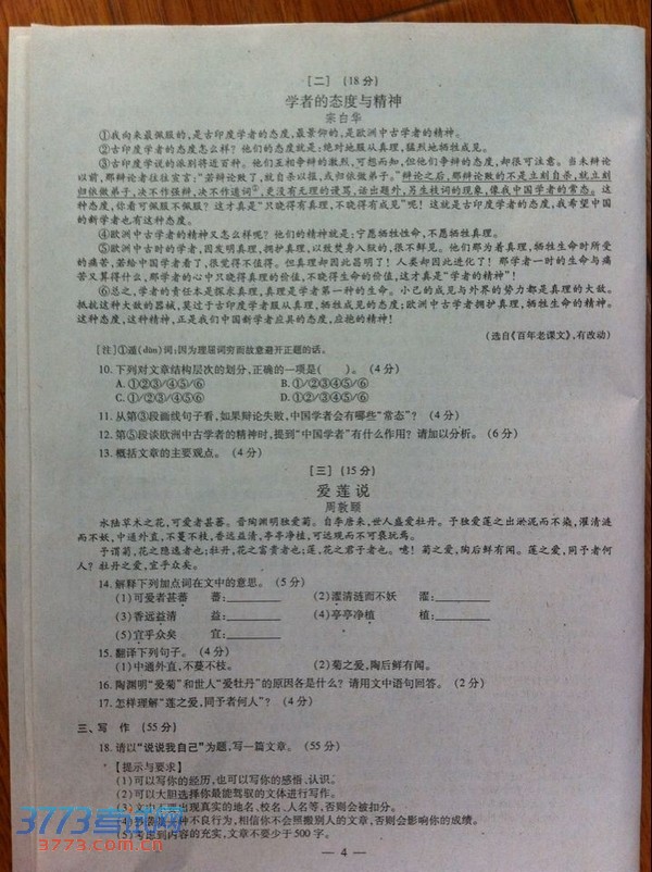 [组图]2014安徽中考语文试题答案及评分标准发布