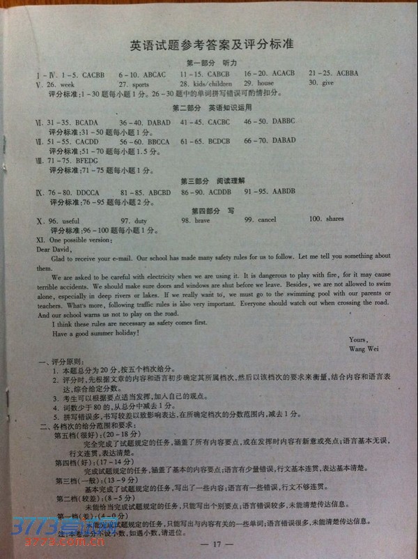 [组图]2014安徽中考英语试题答案及评分标准发布