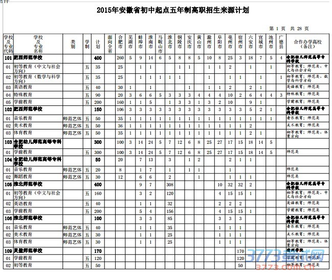 安徽省教育招生考试院关于印发2015年安徽省初中起点五年制高职招生来源计划的通知
