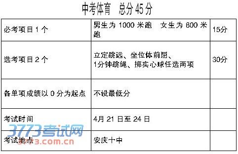 体育考试设必考项目和选考项目,其中必考项目1个,选考项目2个,每个项目各15分,合计45分。必考项目中,男生为1000米跑,女生为800米跑。选考项目中,由考生在立定跳远、坐位体前屈、1分钟跳绳、掷实心球四个项目中任选两项。考试时间定于4月21日至24日,考试地点设在安庆十中。因肢残丧失运动能力(须有残疾证)的考生,可申请免考,免考的证明材料存入考生档案,中考体育成绩按满分计入中考总分。其他因伤、病或意外事故等原因暂不能参加体育考试的考生,可申请缓考,缓考定于2014年4月30日上午在十中举行。