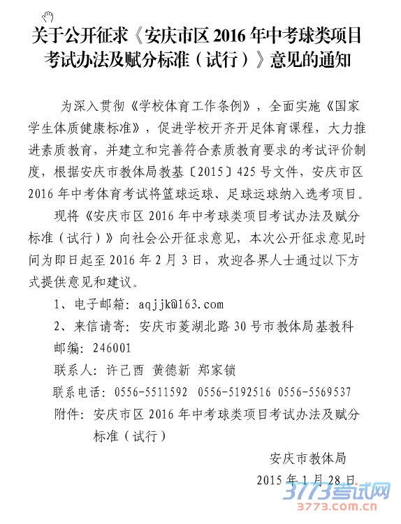关于公开征求《安庆市区2016年中考球类项目考试办法及赋分标准(试行)》意见的通知