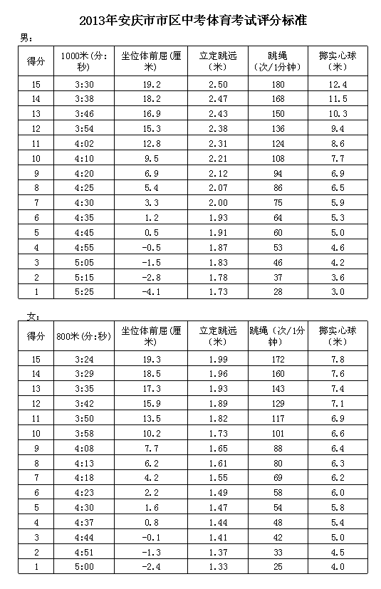 2013年体育考试原始分数与等级转换具体标准如下表: