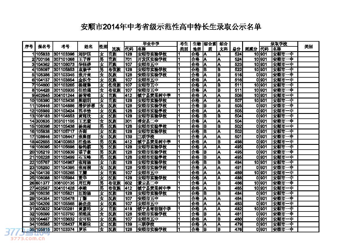 [组图]2014安顺中考省级示范性高中特长生录取名单