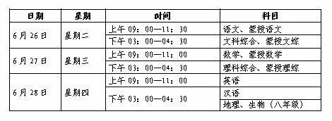 初中毕业生学业考试科目为语文、数学、英语、文科综合(思想品德、历史)、理科综合(物理、化学)共5卷7科,以及物理(化学)实验操作技能、信息技术、体育。蒙授考生加试汉语。考查科目为音乐、美术。八年级考试科目为地理、生物,两科一张试卷。