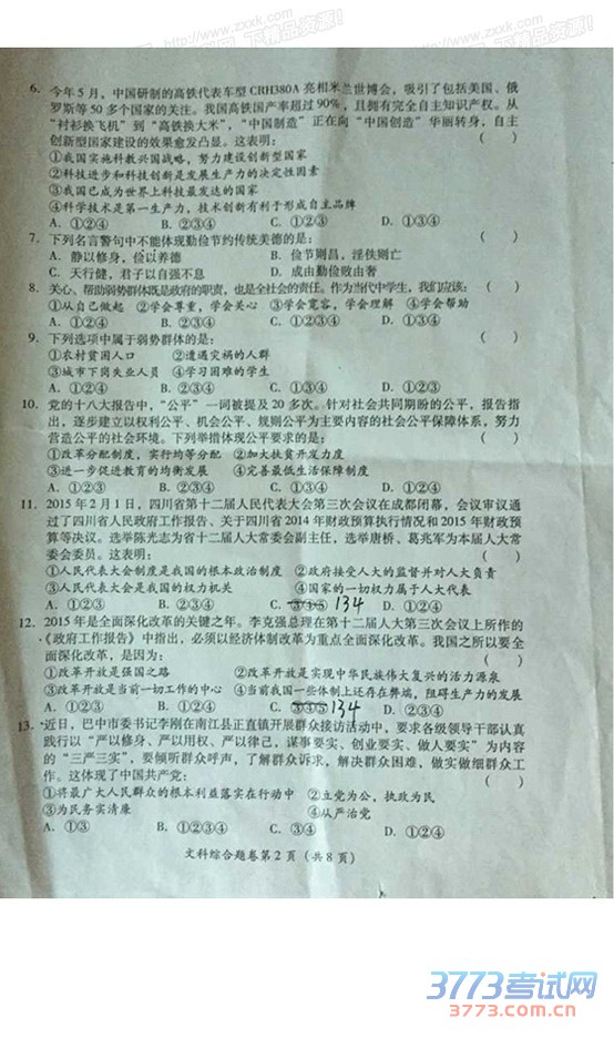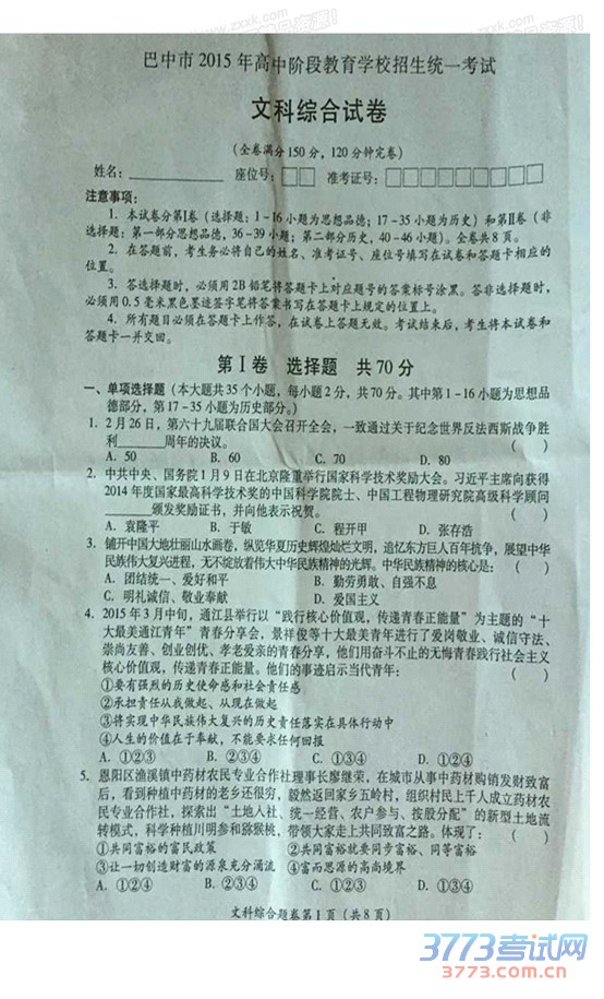 及时公布巴中中考试题、答案和中考作文。祝各位考生都能取得好的成绩。2015年四川省巴中市中考文综政治试题: