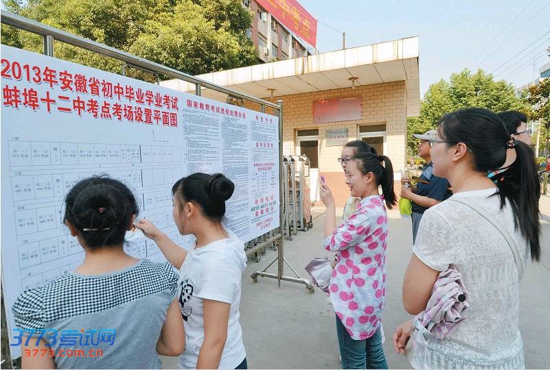 6月13日,考生在蚌埠十二中中考考点外查看考场示意图。记者 刘晨 摄