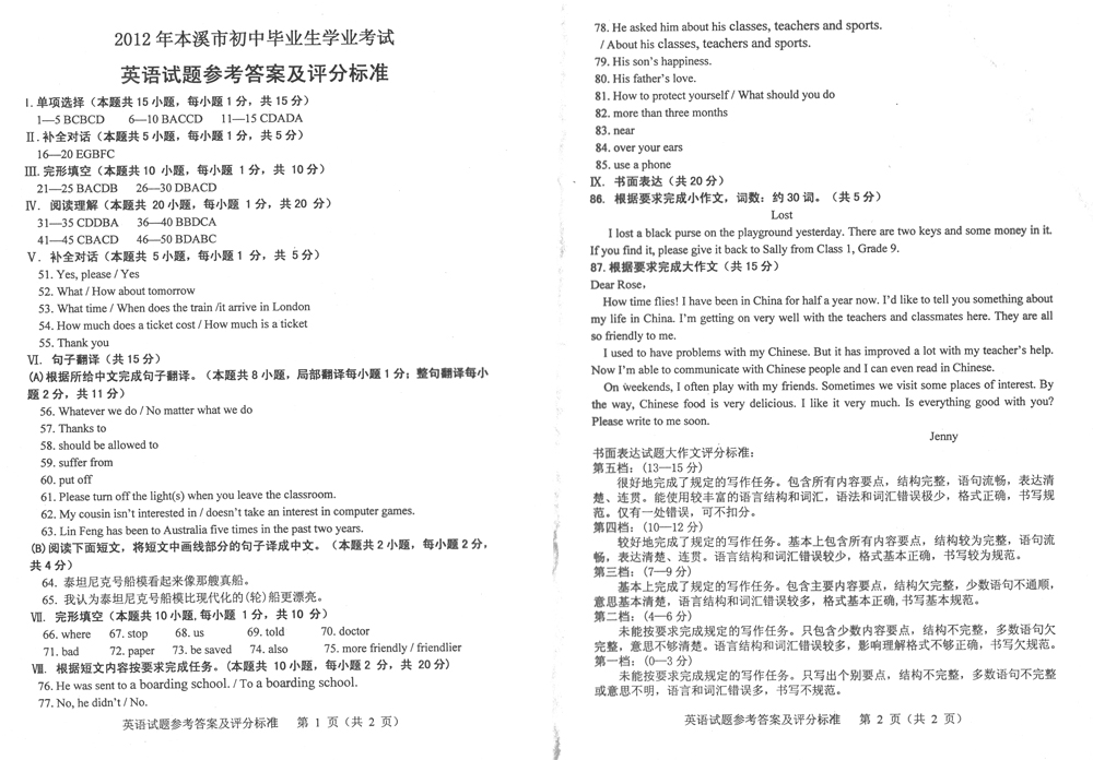 [图文]2012年本溪市中考英语试题答案及评分标准