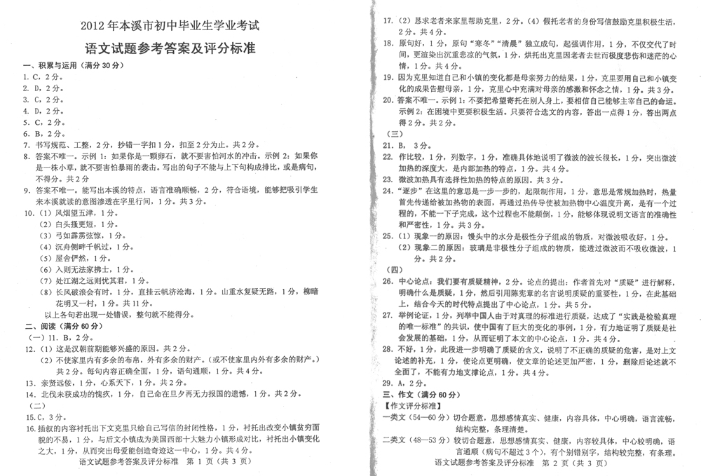 [组图]2012年本溪市中考语文试题答案及评分标准