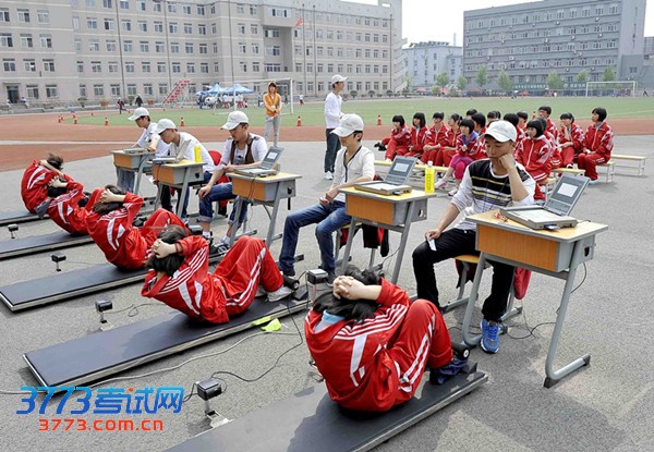 图为市第二十一中学的女生正在进行仰卧起坐考试。