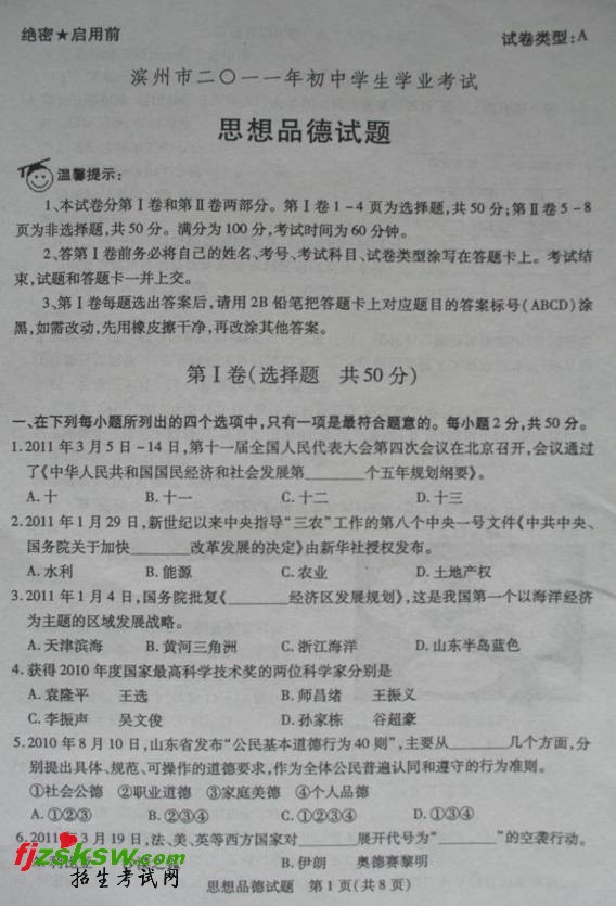 [组图]山东滨州2011年中考思想品德试题及答案