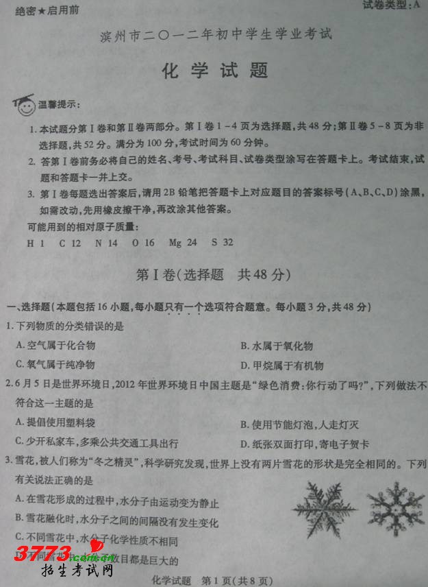 化学试题 2012年滨州中考化学试题答案及评分标准