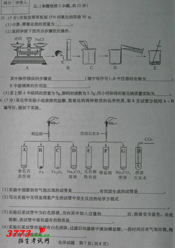 [组图]2012年滨州中考化学试题答案及评分标准