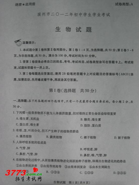 [组图]2012年滨州中考生物试题及答案评分标准