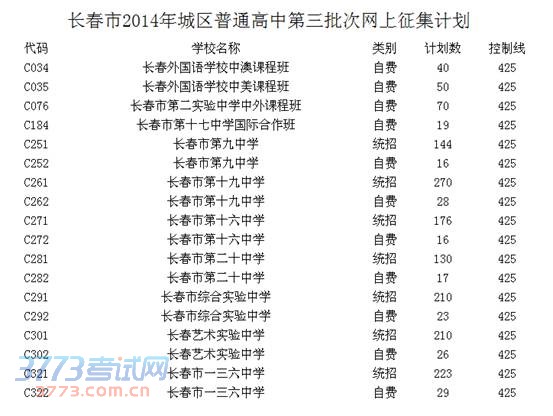 本网7月18日讯(记者李丹)记者从长春市教育局获悉,今天公布长春市2014年城区普通高中第三批次网上征集计划。记者从表上看到,一共有10所高校,共计划招生人数1697人,分统招生和自费生,分数控制线在425分。