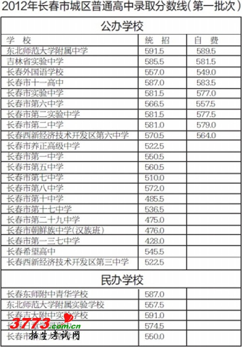 (记者:王威)2012年长春市城区第一批次普通高中录取分数线已经确定(具体见表格)。城区最低控制分数线为420分。