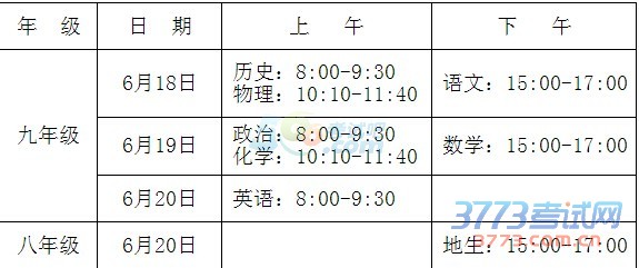 九年级:语文、数学、英语、物理、化学、政治、历史、体育、实验操作(物理、化学)、综合实践活动