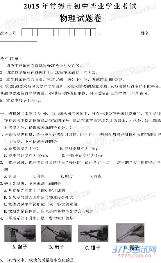 公布常德中考试题、答案和中考作文。祝各位考生都能取得好的成绩。2015年湖南省常德市中考物理试题: