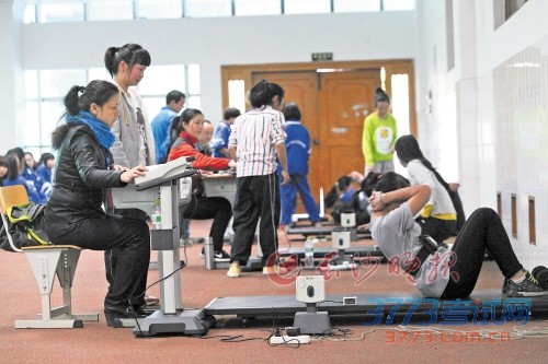 做仰卧起坐的女生腰部也系有一个腰部传感器,旁边有红外线计数装置,考生准确完成一个躺下和坐起,红灯会闪烁一次。仰卧起坐测试区也有不少女生因为动作达不到标准被仪器忽视。