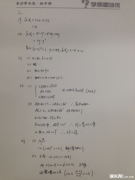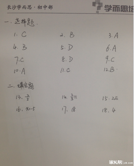 2015长沙中考数学试题答案(手写版):