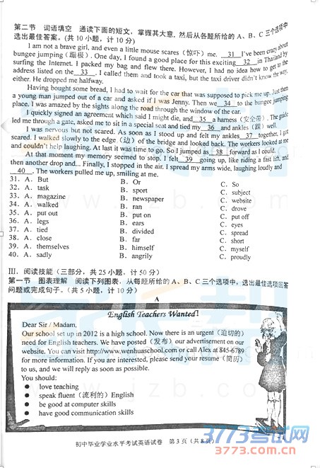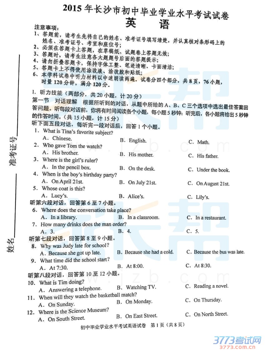 公布长沙中考试题、答案和中考作文。祝各位考生都能取得好的成绩。2015长沙中考英语试题(图片版):