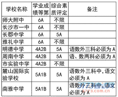 明德中学、周南中学和长沙市实验中学公费录取最低控制线均要求考生的学业成绩等第达4A2B,其中明德中学和周南中学还要求综合素质评定等级为5A。同时,明德中学要求语数外三科必须为A,周南中学要求语、数两科必须为A。
