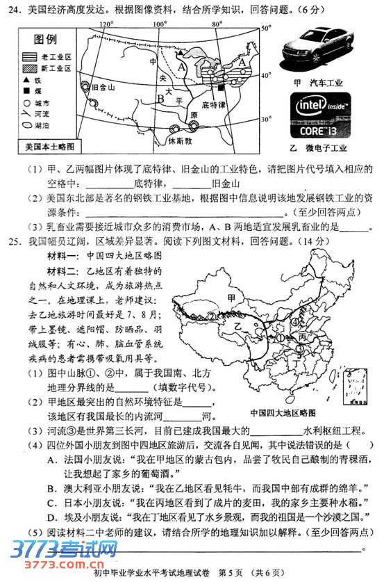 [组图]2013长沙中考地理试卷答案发布