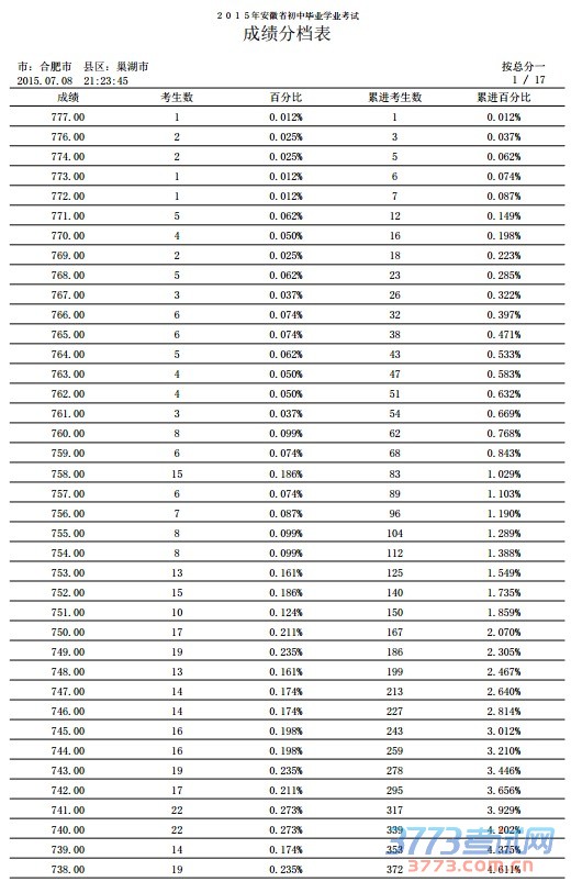 2015中考分档表(未含政策加分、中考查分结果)完整下载!