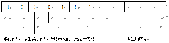 第1-2两位为年份代码统一为16;第3位为考生类别代码,参加当年中考的统一为3;第4-5两位为合肥市代码,第6-7两位为巢湖市代码;第8-12位为考生报名顺序号,顺序号将于2月26日下发到各中考报名点。