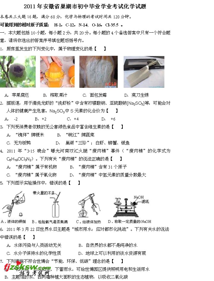 [组图]安徽巢湖2011年中考试化学试题及答案