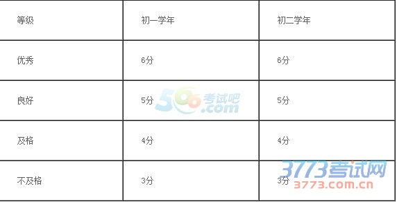 初中一、二年级每学年10分,其中《国家学生体质健康标准》测试占60%(6分),体育课教学考试占40%(4分)。