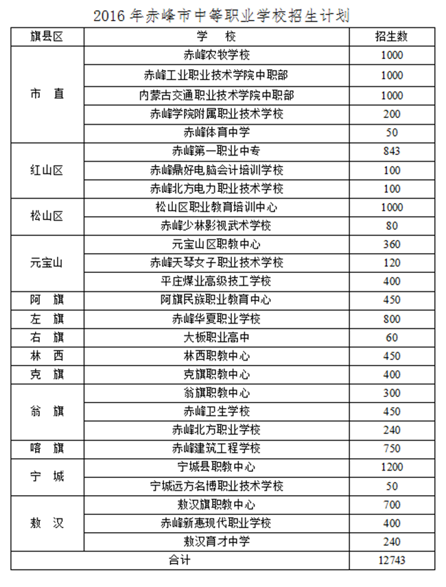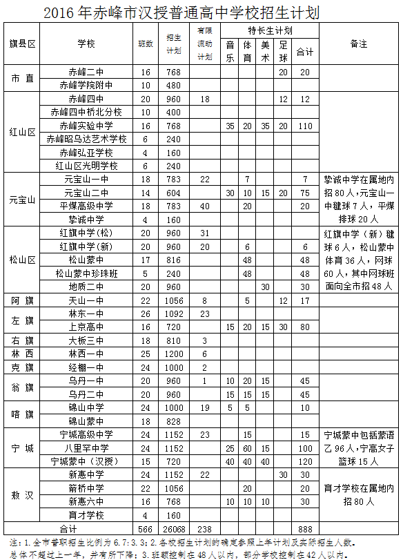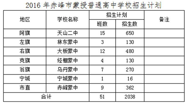 2016年赤峰市高中阶段学校招生计划