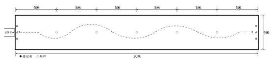 长30米,宽4米,场地四周设置明显的标志线。起点线前5米处开始设置标志杆,标志杆与两侧边线相距2米,共设5根,各杆之间相距5米。起点线中间1米处为考生出发区域。设置方式如图所示: